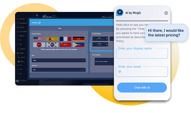 Increase website conversions and boost customer engagement with RingQ Live Chat. Compatible with popular CMS platforms; WordPress, Joomla, Drupal, and Squarespace, RingQ Live Chat comes preloaded with intelligent chatbots and Chat GPT to respond instantly—helping you capture leads and assist visitors faster than ever.