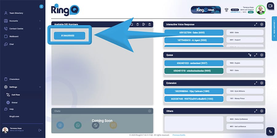 From the Available DIDs screen drag and drop the DID you want to assign into any of the IVR, Extenion, Queue or Other (Conference) containers.