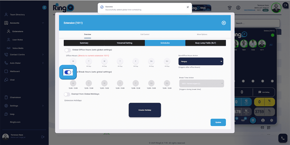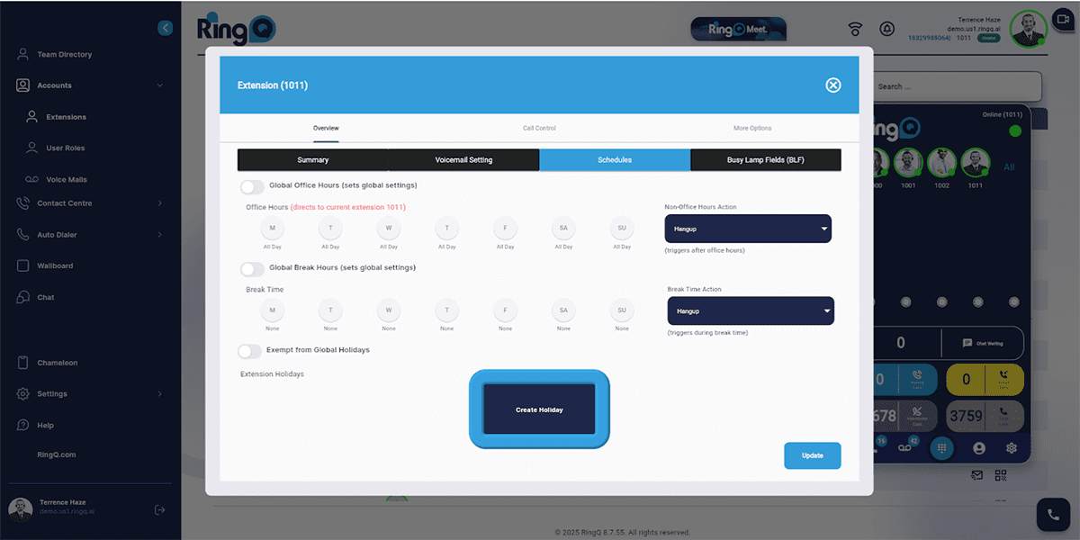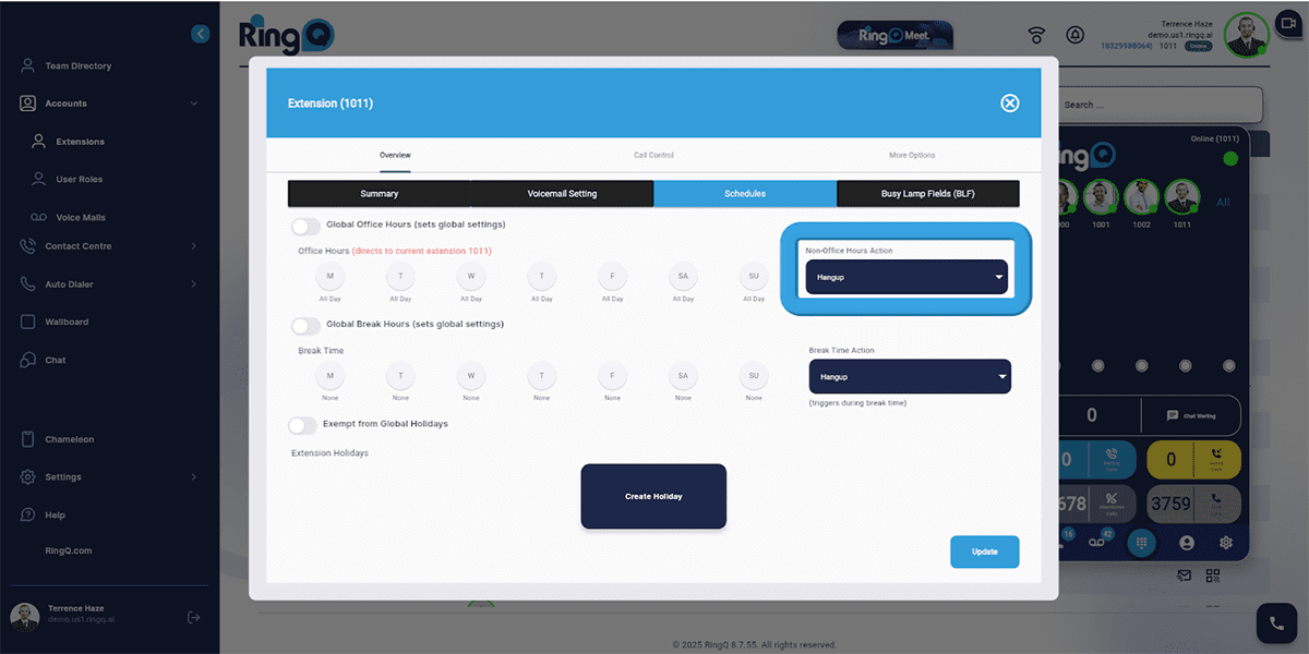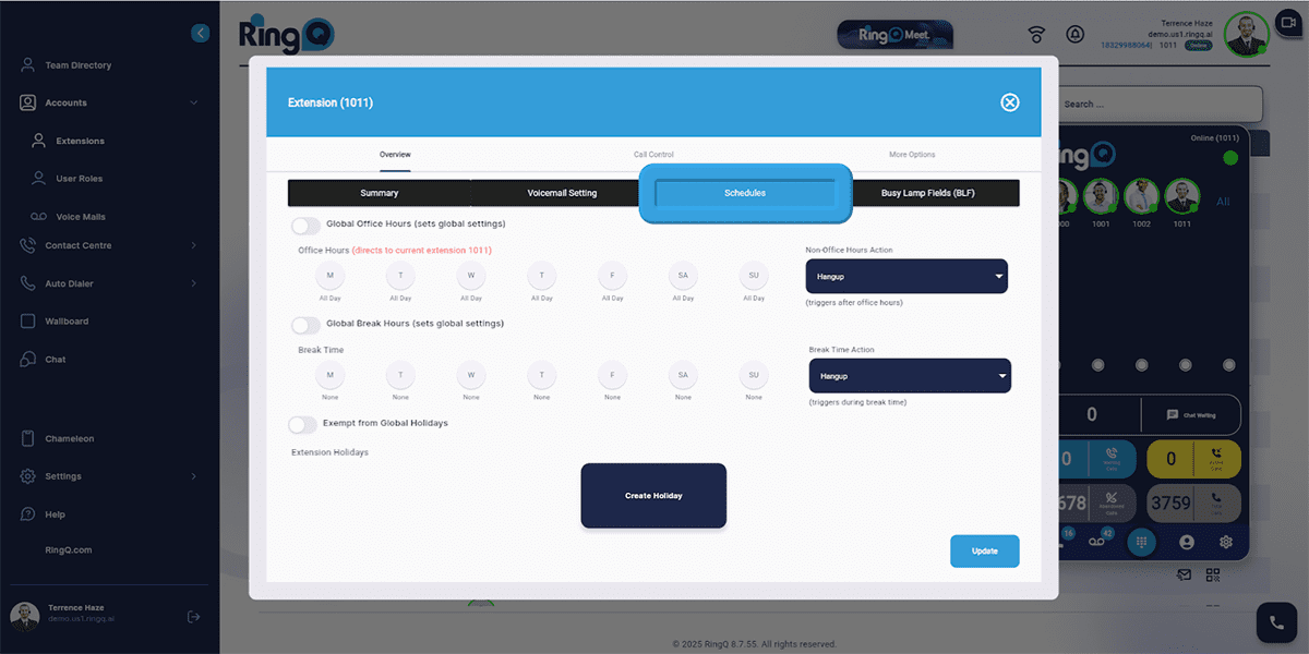 Setting accurate schedules for extensions ensures calls are handled appropriately during working hours, holidays, and out-of-office periods. In this guide, we’ll show you how to manage extension schedules in RingQ—including setting working hours, configuring holiday rules, and automating call handling based on availability.