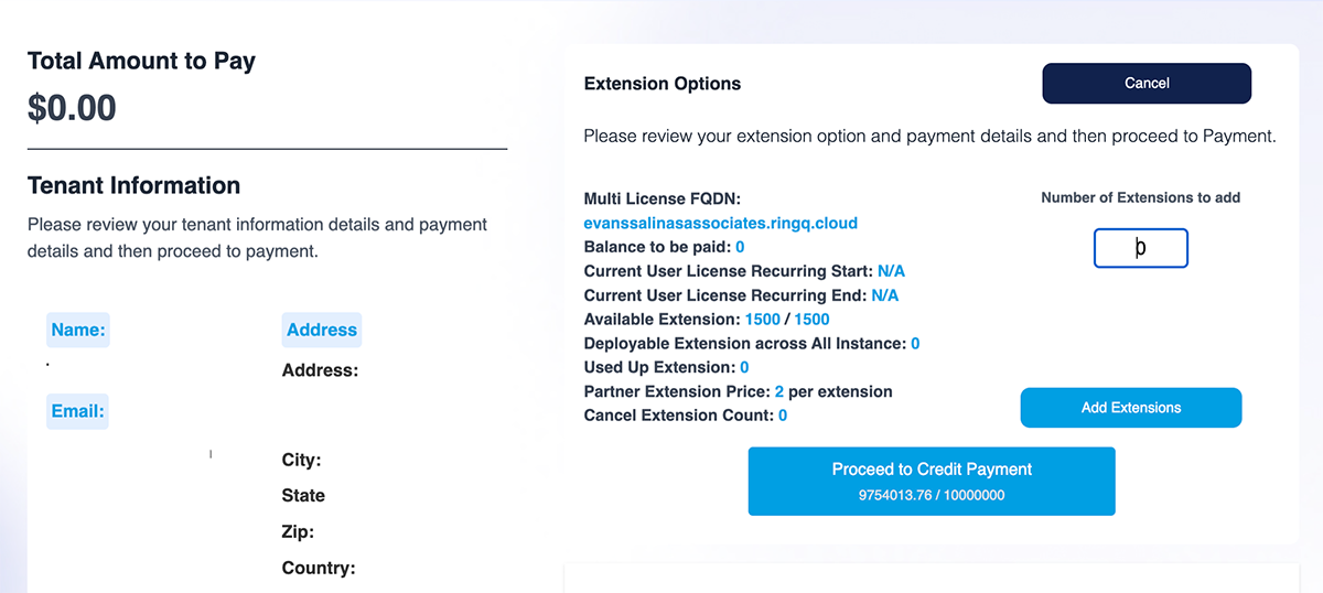 Adding Tenants 1. Locate the multi-tenant license you want to manage from the “Licenses” page 2. Click on “Add Tenant”. 3. In the next page fill in the details of your new tenant and click “Submit”. 4. The new tenant will receive an activation email in their inbox. They must click on the “Activate Account” button in the email to activate their account. 5. Upon clicking on the activation email they will be directed to their RingQ web app. 6. Their status in the Customer Portal will change from “Pending” to “Active”. Adding Extensions To add extensions to any tenant, you must ensure that you have purchased extensions beforehand. 1. Locate the multi-tenant license you want to manage and click on “Buy Extension” 2. Enter the number of extensions you want to buy, agree to the terms and conditions and click “Proceed to Payment”. 3. You will notice that the number of your deployable extensions have now changed from “0” to the number of extensions you just purchased, in the example above it’s “3”. Note: The first time you add extensions to any tenant the minimum number of extensions you can add is 5. 5. You can now proceed to add extensions to any tenant. 6. Locate the tenant you want to add an extension to and click on the “Add Extension” option as indicated above. 7. Enter the number of extensions you want to add, if this is the first time you’re adding extensions you must add at least 5. Click “Yes”. 8. The extensions have now been added to the selected tenant. Repeat the process for other tenants as the need arises. 9. You can also cancel extensions if the need arises. From here you can also: