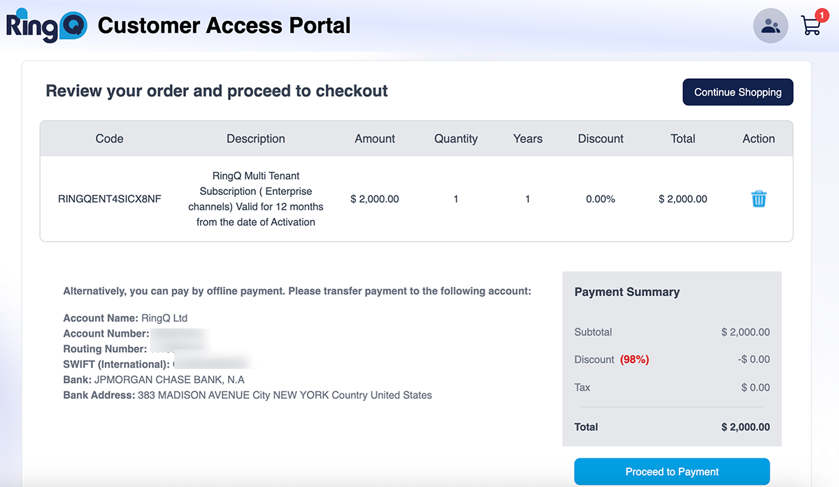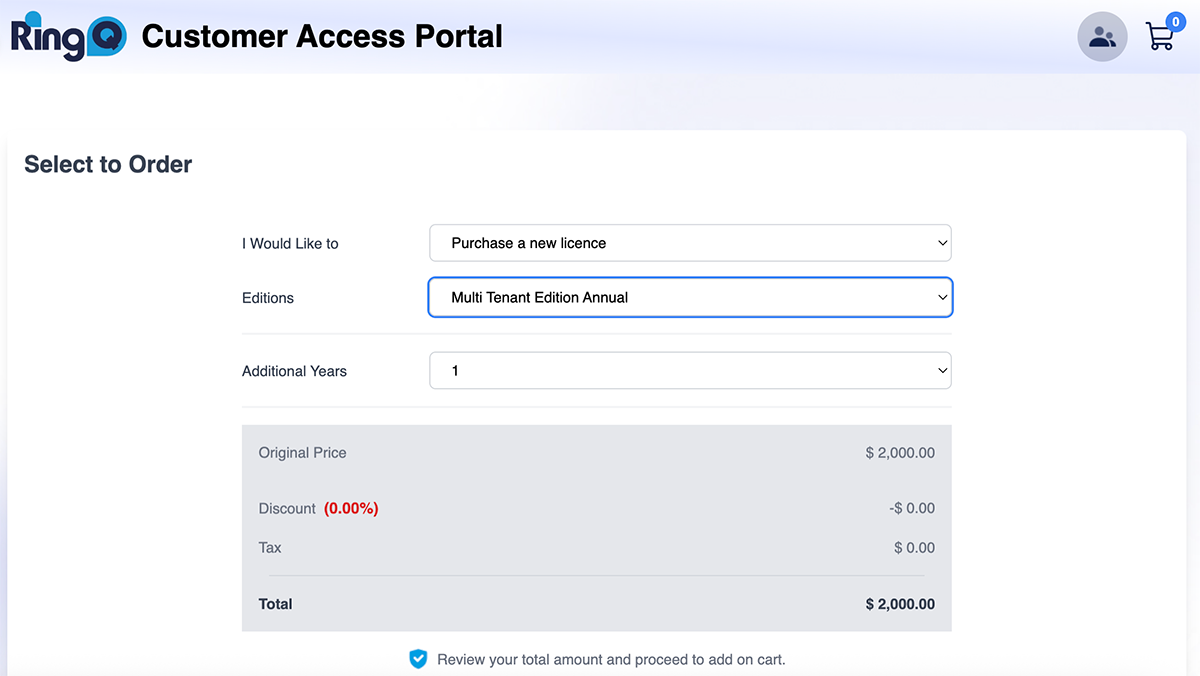 1. Login to your customer portal account at: https://cap.ringq.com//login/ 2. Click on the “Purchase” option on the left sidebar. 3. In the “I would like to” option select “Purchase a new license” 4. In the “Edition” option Select “Multi Tenant Edition Annual” 5. Choose your license duration (e.g., 1 year, 2 years) 6. Click “Add to Cart” 7. Click “Proceed to Payment” and complete the payment process. Note: Multi-Tenant Edition licenses are not eligible for discounts.