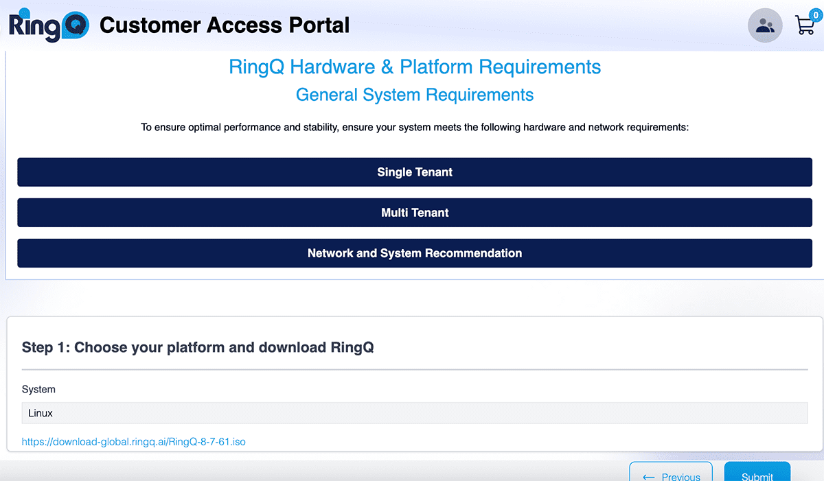 1. Go to the “License” option on the left sidebar 2. Locate your new Multi-Tenant License and click “Set Up” 3. Fill in all the requested fields and click next. 4. The following screen informs you about the number of extensions your system will have. 5. Then choose your country, language and prompts. 6. On the last page you will be informed of the system and hardware requirements for RingQ to work efficiently as well as a download link for your multi-tenant server. Click on this link to begin downloading RingQ. 7. Click “Submit”. Your account is now registered. 8. To install and configure the downloaded file follow the steps in the RingQ ISO Installation Guide. You will also be able to add your first tenant.