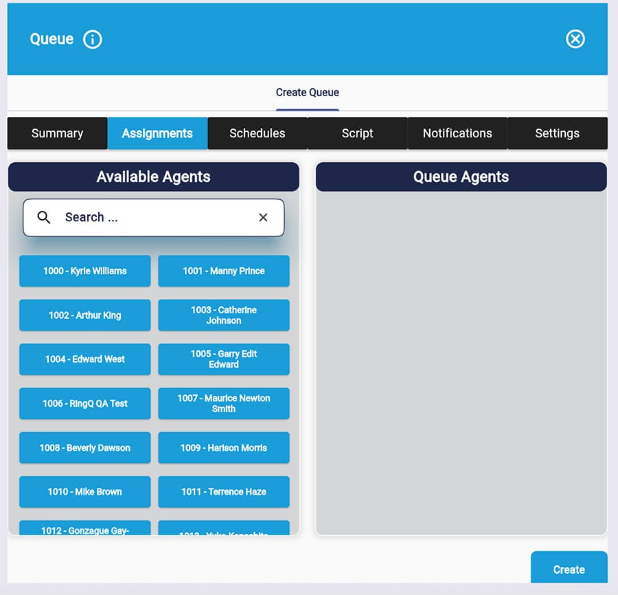 4. In the “Assignments” tab drag and drop the agents who should be members of the queue.