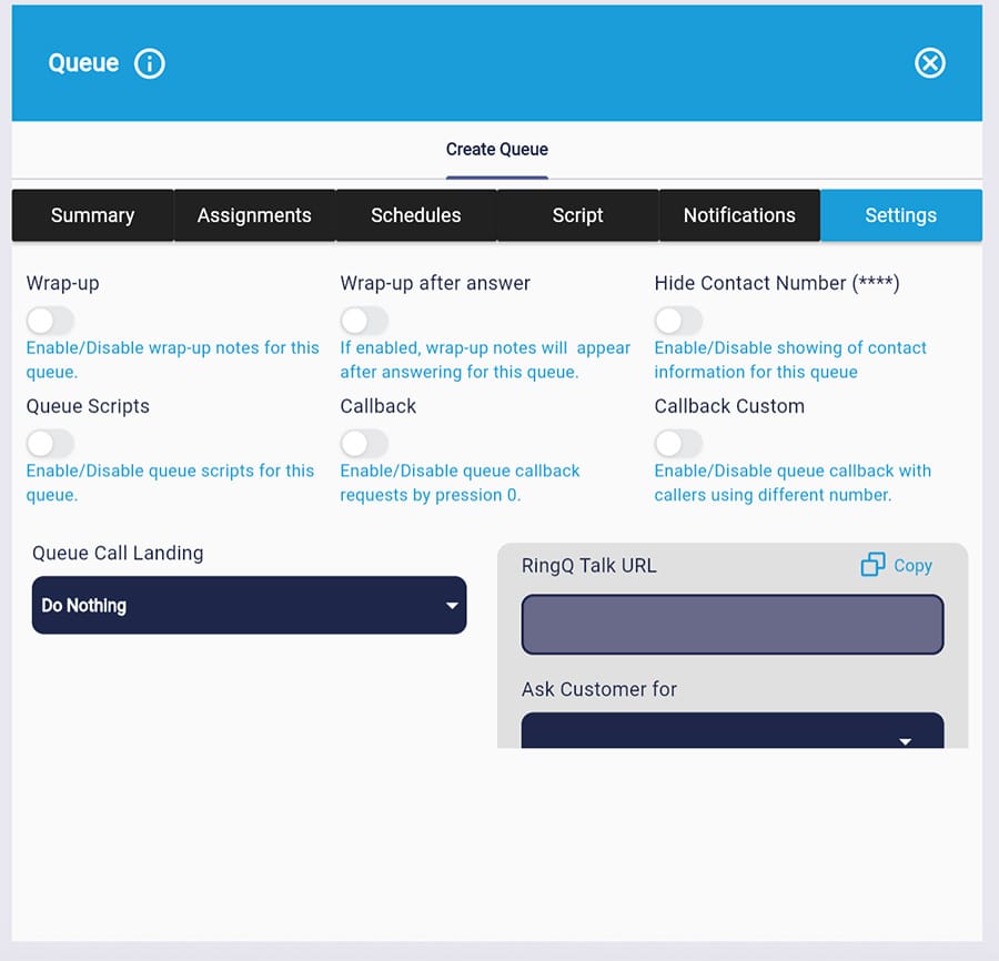 8. In the “Settings” tab you can enable and disable certain queue actions. You can also locate the queue’s Talk URL to add to email signatures, social media and your website. The Talk URL enables customers to call you for free by clicking on the URL.