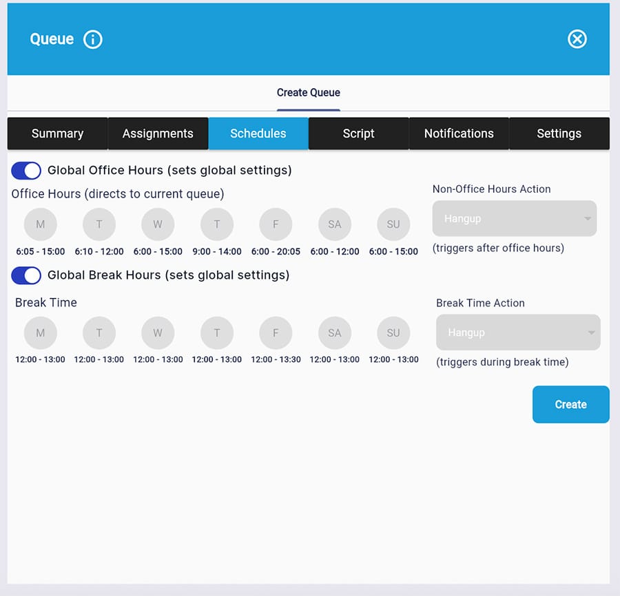 5. In the “Schedules” tab select whether the queue should follow the global office and break hours. If not, manually add the hours the queue is available. Add the non-office and break time actions.