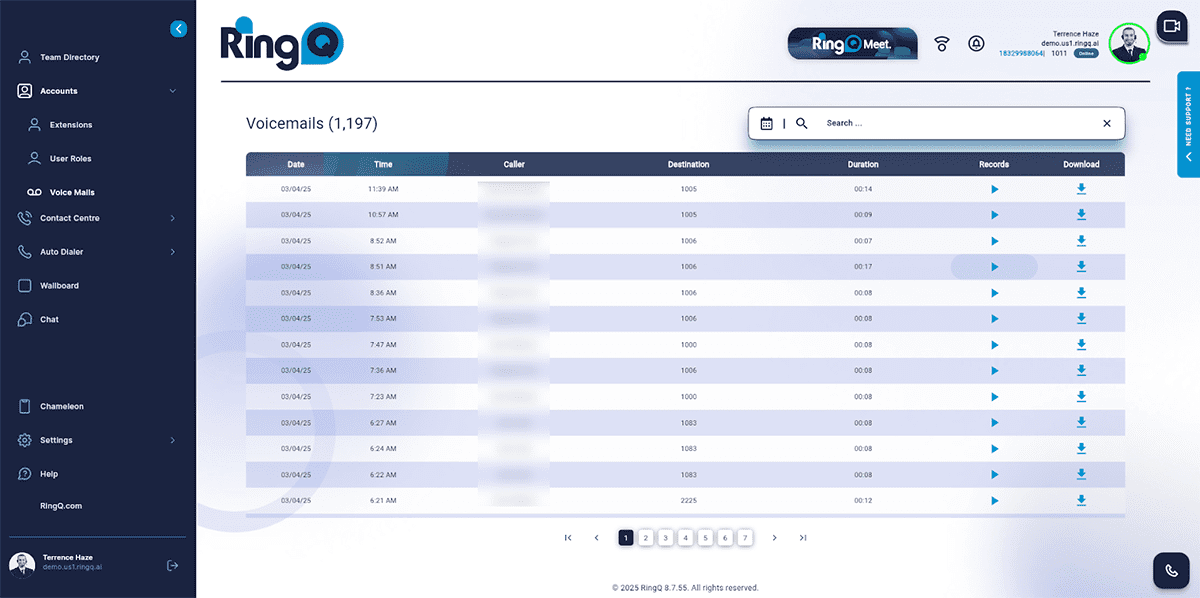 Users can easily search for specific voicemails by entering Direct Inward Dialing (DID) numbers for external calls or extension numbers for internal calls. Additionally, filtering options by date or date range are available to narrow down search results.