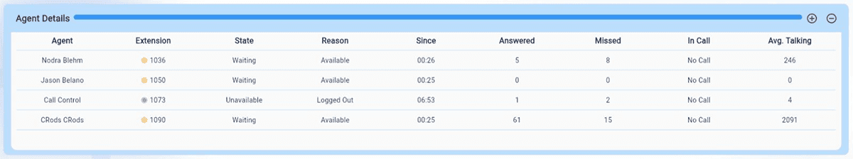 - State – Agent’s status whether Waiting, Receiving, Unavailable or in a Queue Call.
